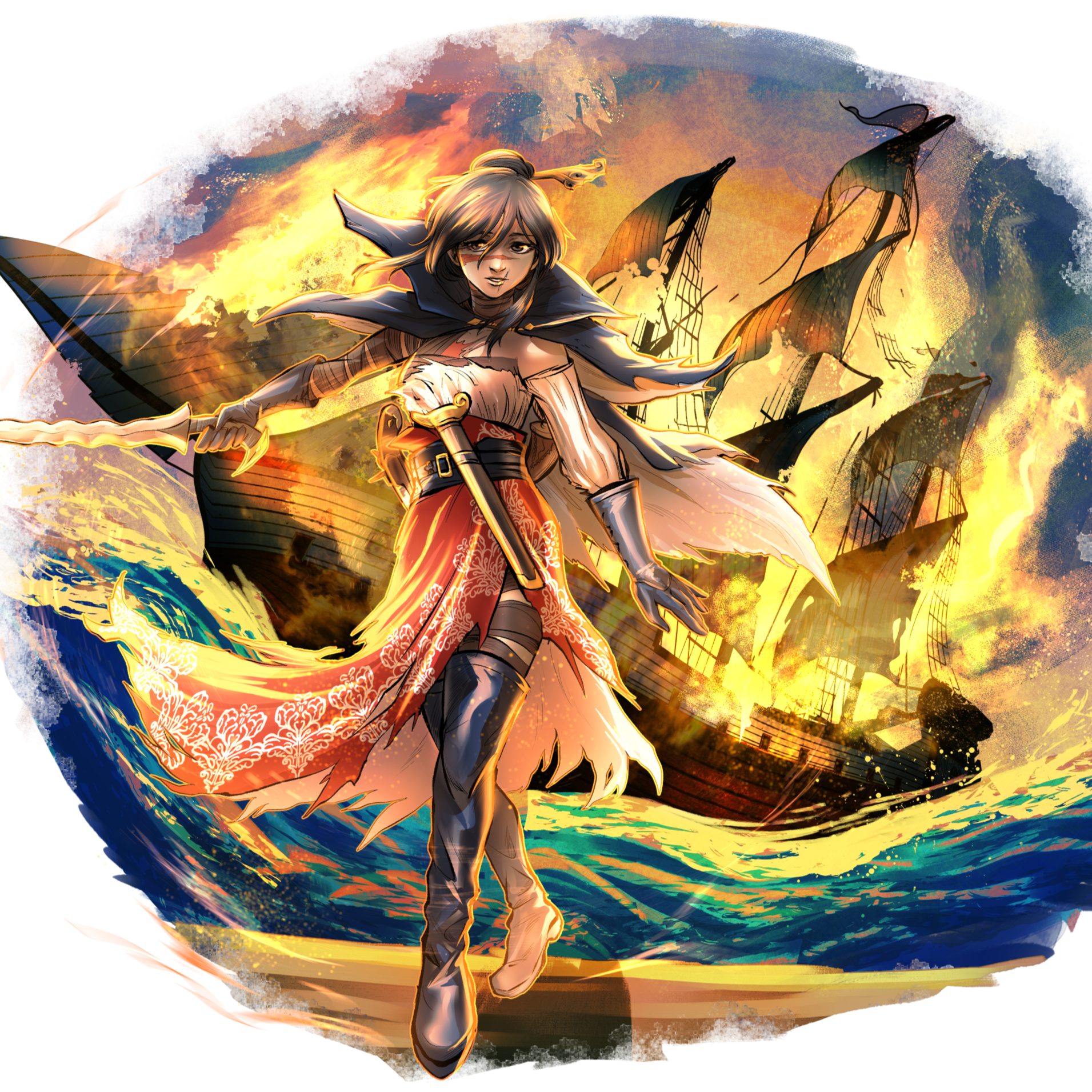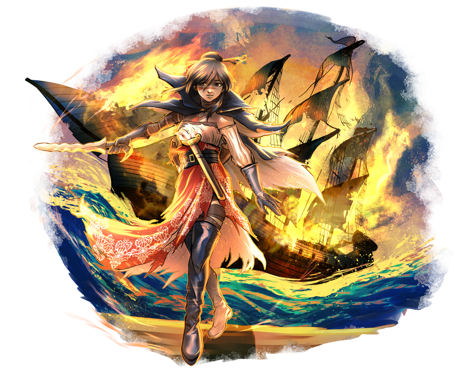 A pirate lady seeking the truth behind her captain’s death.Gadis bajak laut yang terus mengejar misteri kematian kaptennya.船長の死の謎を追い続ける海賊姫。